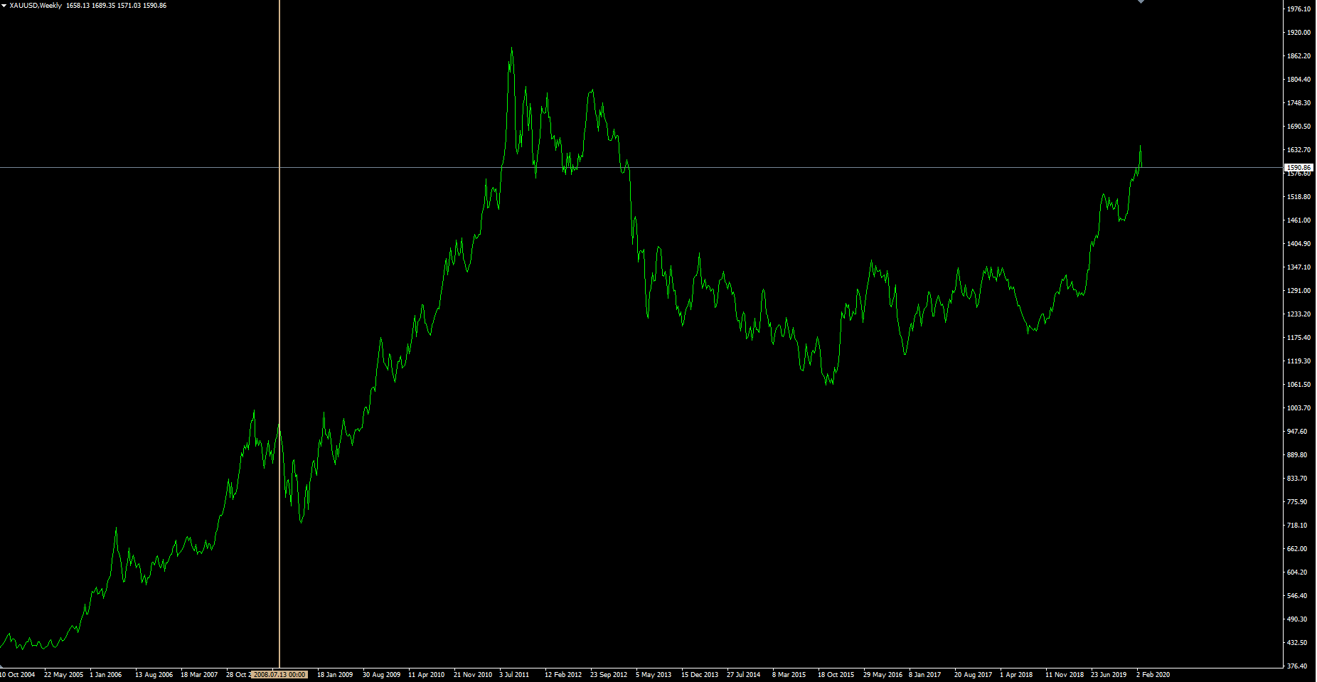15 ans d'once d'or en $ (en 2008 l'or baisse avant de remonter) :
