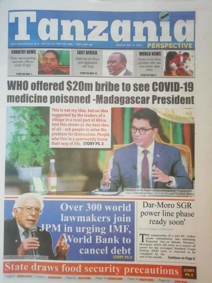 * Le président de Madagascar affirme qu'il s'est vu offrir vingt millions USD (20 millions de dollars) par l'Organisation mondiale de la santé (OMS) pour ajouter un peu de poison dans la boisson à base de plantes qu'ils avaient fabriquée pour guérir covid19