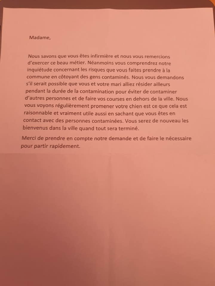 Il n'y a pas qu'à Paris... A Vulaines/ Seine  en Seine et Marne une infirmière a également reçus ça dans sa boite aux lettres.    https://www.francetvinfo.fr/sante/maladie/coronavirus/seine-et-marne-le-coup-de-gueule-dun-maire-contre-une-lettre-anonyme-visant-une-infirmiere-de-sa-commune_3885459.html