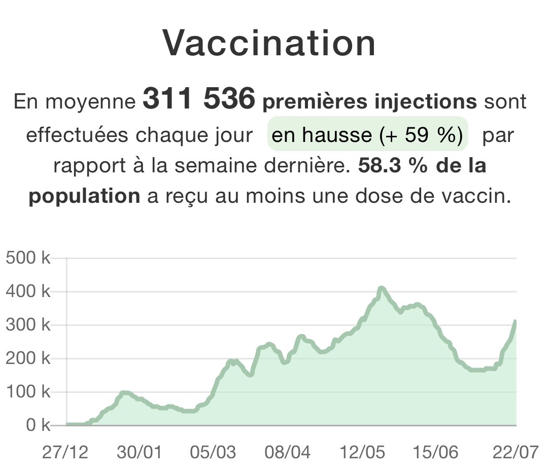 Les premières injections de vaccin sont toujours en hausse depuis une dizaine de jours. +59% en une semaine, on approche doucement du record de mai dernier.