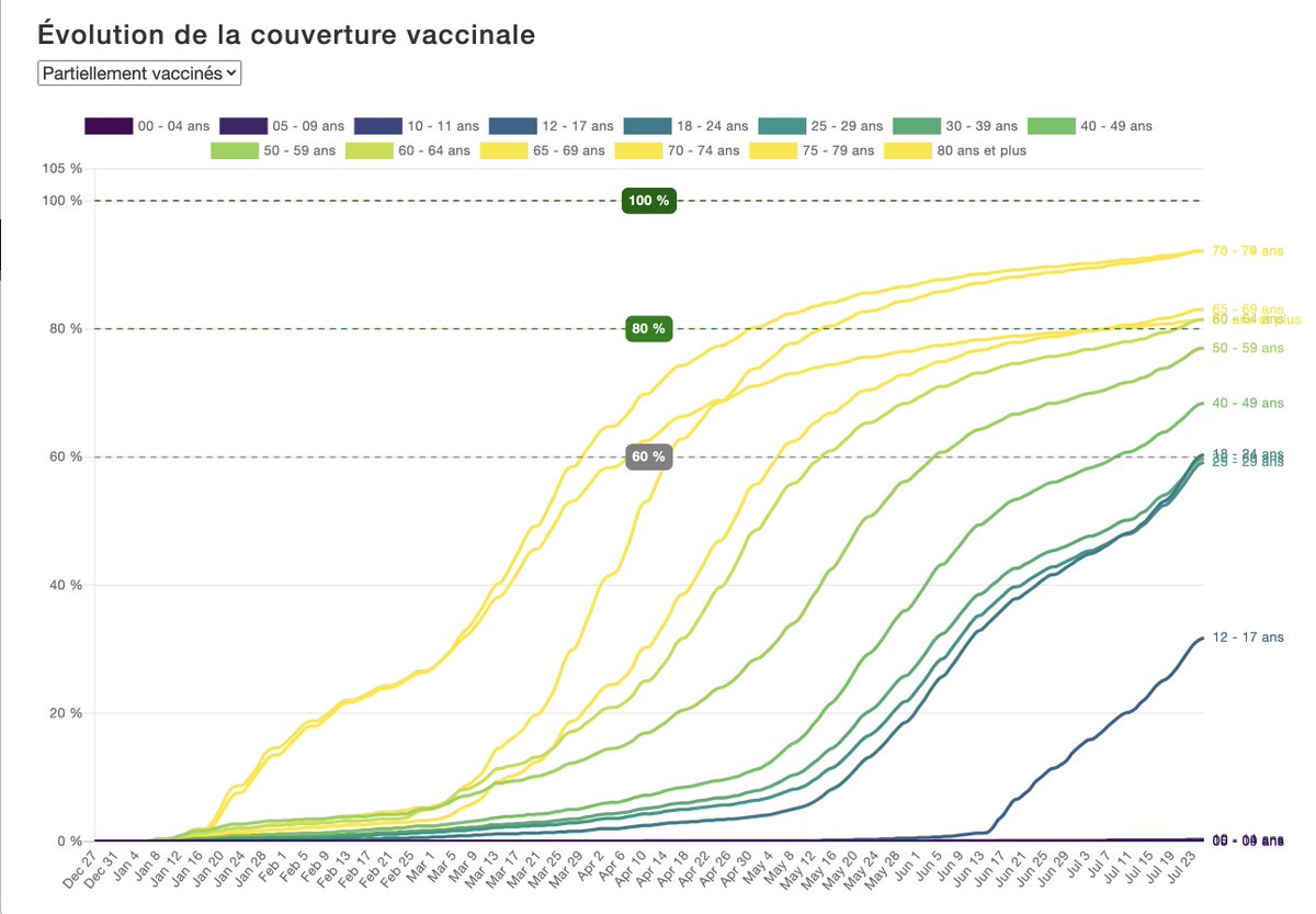 Depuis l’intervention du Président de la République, la campagne de vaccination est surtout repartie chez les 18-39 ans (les 3 courbes en bleu-vert quasiment superposées). Ils sont désormais presque 60% à avoir reçu une dose de vaccin.