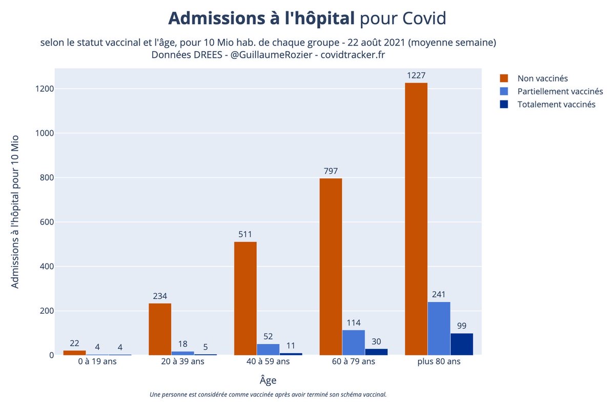 C’est pas très visible sur le précédent graphique, mais on observe aussi 6 fois moins d’admissions chez les jeunes de moins de 19 ans qui sont vaccinés, par rapport aux non vaccinés.