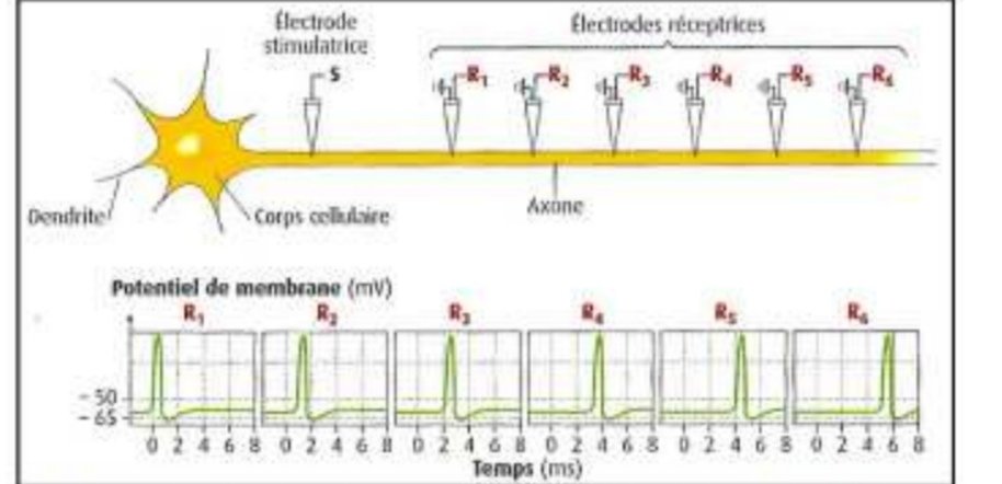 Le potentiel de repos d'un neurone se situe vers -50 mV à -55 mV ( comme sur le schéma ) et le seuil d'excitation vers 15 à 20 mV ( c'est le tout ou rien )
