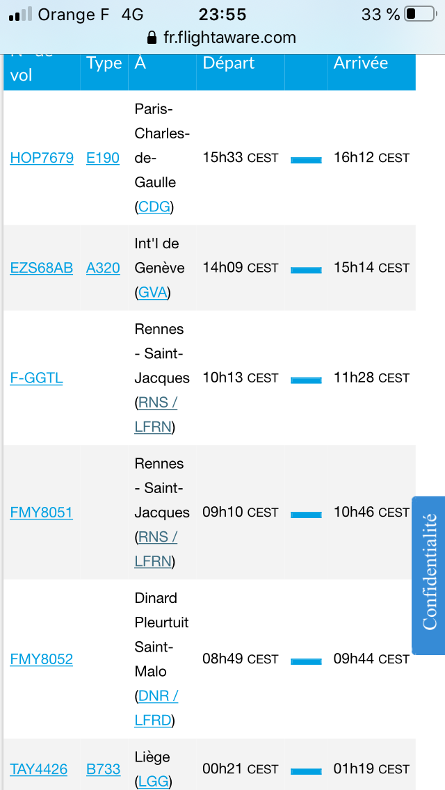 Je sais avoir raison quitte a raconter n'importe quoi ... votre tracking est pour des horaires données (revoyez le lien ... mise a jour tous les 3 ou 5 min citée ) ... J'habite ici je n'ai pas "que" des origines bretonnes je suis pur jus et y habite .... je rajoute qu'étant centre sud ... donc au nord de l'aéroport ... il y a peu de couloirs aériens ... Il n'y a pas de longs courriers les correspondances sont assurées pour CDG (en temps normale itou Orly) Beaucoup de petites compagnie vers villes européennes (Espagne, Grèce, etc.....) et villes de France .... Début de frêt ... NDL étant abandonné Rennes va probablement s'étoffer dans ce domaine ... mais pour le moment on en reste là ... il y faudrait d'autres infrastructures ... et nous avons un rail actif ... et  et et et .... Venir de la région parisienne voire sa famille en avion il faut être à la masse, LGV et TGV de centres villes a centres villes ... Merci de clore définitivement le HS  ... vous l'alimenté soit pour empêcher l'autre de répondre et ainsi avoir "toujours" raison ... ou comme je viens de le faire vous forcez la réponse et accusez votre interlocutrice de HS ... Ca ne trompe personne et ça devient ridicule .... mes petits enfants ados on laissé ce processus tomber depuis un moment !!!