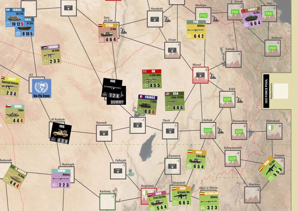 "Fitna" est très différent, et a largement profité de l'évolution des jeux de stratégie depuis une vingtaine d'années. La carte, bien que de bonne taille, est néanmoins beaucoup plus maniable : on pourra y jouer ailleurs que dans son garage. Les pions, moins nombreux, sont grands et très beaux. La carte se concentre essentiellement sur le Proche-Orient. Le jeu utilise des cartes à jouer, par exemple pour simuler les événements politiques et aussi les opérations aériennes, dont la gestion, bien que passionnante, prenait beaucoup de temps dans "Gulf Strike". On est très loin de l'époque de la guerre froide, même si bien sûr Russes et Américains sont toujours dans le coin. Il doit exister au bas mot une bonne dizaine de milices différentes, en plus des pays de la région. Tout cela est bien sûr assez complexe. Autant qu'un jeu de guerre, "Fitna" est donc aussi un jeu de négociation. Il existe une dizaine de scénarios, mettant en scène tous les principaux belligérants du Proche-Orient. On peut donc se livrer au plaisir un peu pervers de refaire les guerres de DAESH, et de voir si l'État islamique aurait pu gagner.:dev: Seul petit défaut à mon avis, malgré son nom, le jeu ne rend peut-être pas assez compte de l'aspect chaotique d'une région du monde, où vraiment TOUT peut arriver.