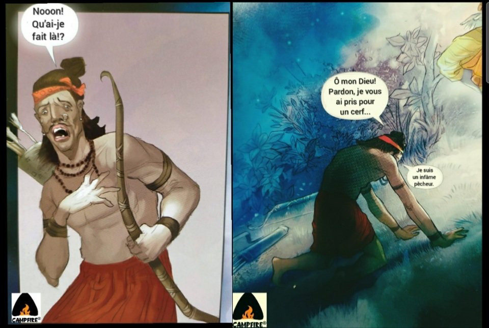 Voici un exemple de ce dont je parle lorsque j'affirme qu’Étienne Klein ne peut comprendre le contenu de la littérature védique sans prendre la peine de se pencher dessus. Cette image reproduit l'émoi d'un chasseur tribal s’apercevant avec effroi que sa cible est un humain. Pis que ça, c'est Krishna lui-même qui se reposait sous un arbre! Sa flèche l’a atteint au talon, ce fameux talon d'Achille... Il réalise immédiatement les conséquences dramatiques de son geste: Krishna est mortellement atteint... Le pauvre hère est submergé sous l'illusion produite par ses émotions qui lui empêchent une analyse sereine de la situation. Dieu n'a pas de talon d’Achile. Bien qu'il paraisse sous une forme humaine, sons corps est complètement spirituelle. Dixit la Bhagavad-gita.