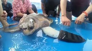 Hier en regardant le Quotidien j'ai vu une image sympa et rassurante, une Tortue a eu une de ses palmes amputée par un filet de pêche,  une équipe de médecins ont décidé de lui reconstituer une prothèse en se basant sur l'autre nageoire.
