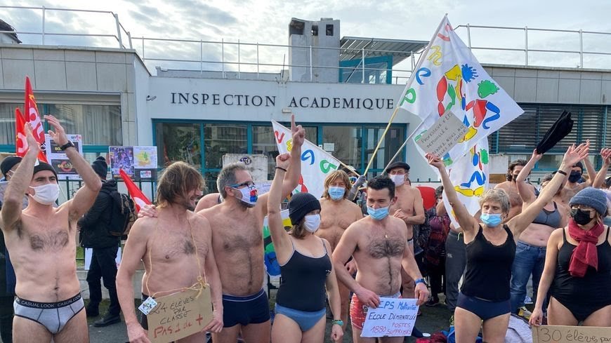 À Périgueux, les profs d'EPS n'ont pas froid aux yeux, ni ailleurs d'ailleurs ! Ce mardi midi, ils se sont "mis à poil" devant l'inspection d'académie. Une quinzaine d'enseignants ont retiré leurs habits pour se retrouver en sous-vêtements alors qu'il faisait 0 degrés.  Ils dénoncent "le mépris du gouvernement qui les met dehors pour faire cours". Des conditions de travail qui sont "inadmissibles" selon le SNEP/FSU, le Syndicat National de l'Education Physique.