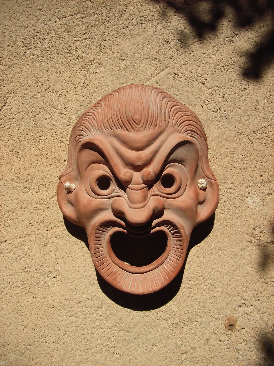 Comment jouaient les acteurs antiques dans leurs immenses théâtres en plein air ? En plus avec leurs masques souvent ? Je me suis amusé à reproduire le fameux masque de la tragédie en terre cuite, et j'ai remarqué que la forme de la bouche, quand on parle  faisait légèrement porte voix...