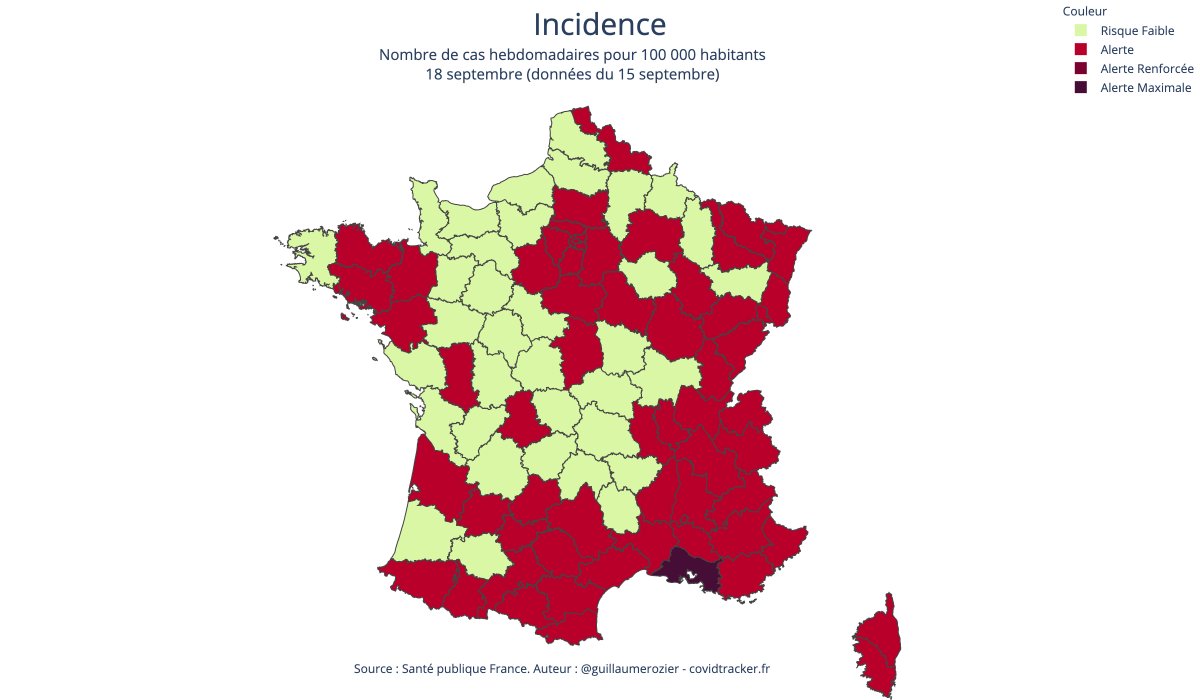 67 départements devraient être classés rouge, car ils dépassent le niveau d'alerte de 50 cas pour 100 000 habitants en 7 jours (données du 15/09)