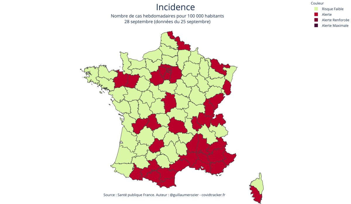 45 départements devraient être classés rouge, car ils dépassent le niveau d'alerte de 50 cas pour 100 000 habitants en 7 jours (données du 25/09)