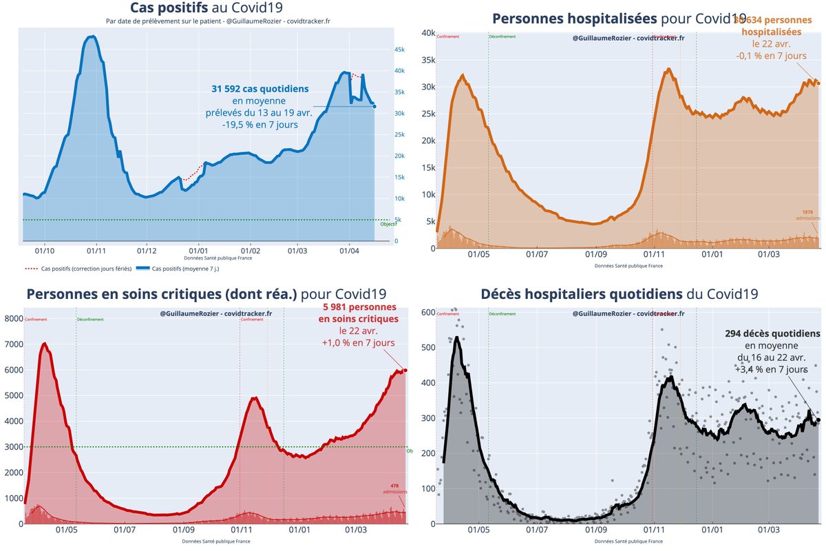 Chiffres #Covid19 : • 285 personnes décédées en milieu hosp. (22/04), en baisse sur 7 j. (-15) • 1878 admissions à l'hôpital (22/04), en baisse sur 7 j. (-184) • 46413 cas positifs (19/04), en baisse sur 7 j. (-5750)
