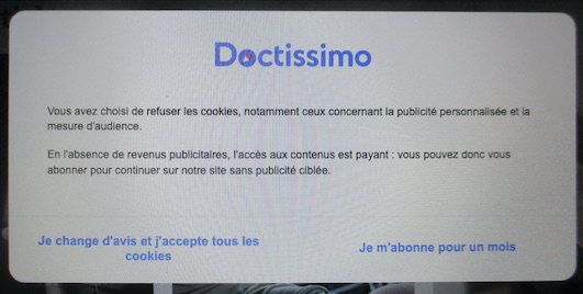 Ci-dessous l'encart qui s'affiche si on refuse les cookies sur Doctissimo. Nous n'y avons tout simplement plus accès. A moins de payer 0,49 € par mois.