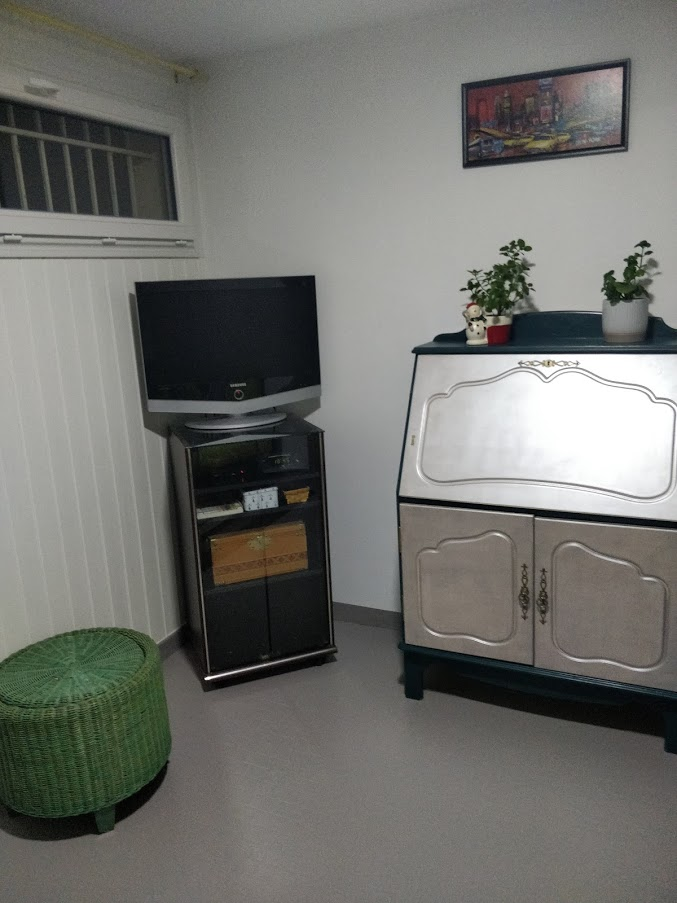 Puis j'attaquerais un meuble, très moche à l'origine, vous le voyez derrière la table de nuit, avant peinture. Ce meuble est moche, mais fonctionnel, et plus c'est moche, plus c'est marrant de le rendre beau. Les serrures étaient arrachées, et les pieds en biais rectangulaires ne me plaisaient pas. Mon mari a appris à travailler la pâte à bois, il a changé les pieds par des boules en bois et a entièrement poncé le meuble. à moi de jouer maintenant.