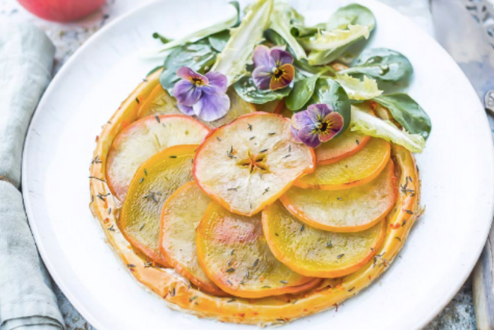 6.Déposer la rosace de betterave/pomme Pink Lady® précuites sur le confit d’oignon et enfourner recouvert d’un disque de papier sulfurisé, pendant 20 minutes.