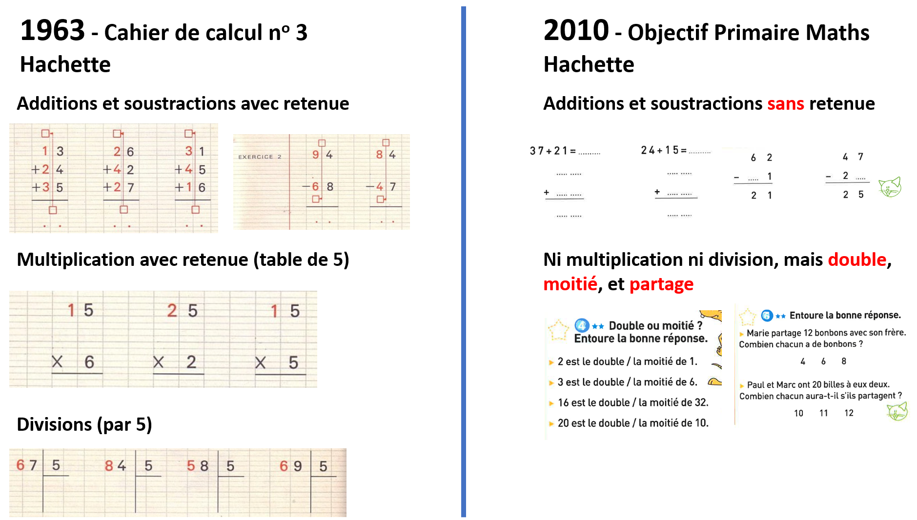 des exercices de mathématiques pour CP, sortis de deux livres Hachette, en 1963 et en 2010.