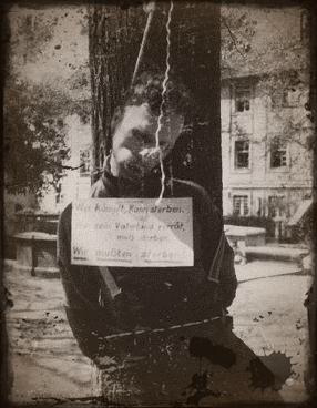 Mais le bras politique de l’armée allemande empêchait de répondre à de telles invitations. La police militaire et des escouades spéciales de S.S. traquaient les déserteurs et les traînards, pour les traduire devant des cours martiales volantes, qui ne prononçaient pas de condamnations plus légères que la pendaison. A l’arrière du front, des corps pendaient aux arbres, avec des écriteaux :