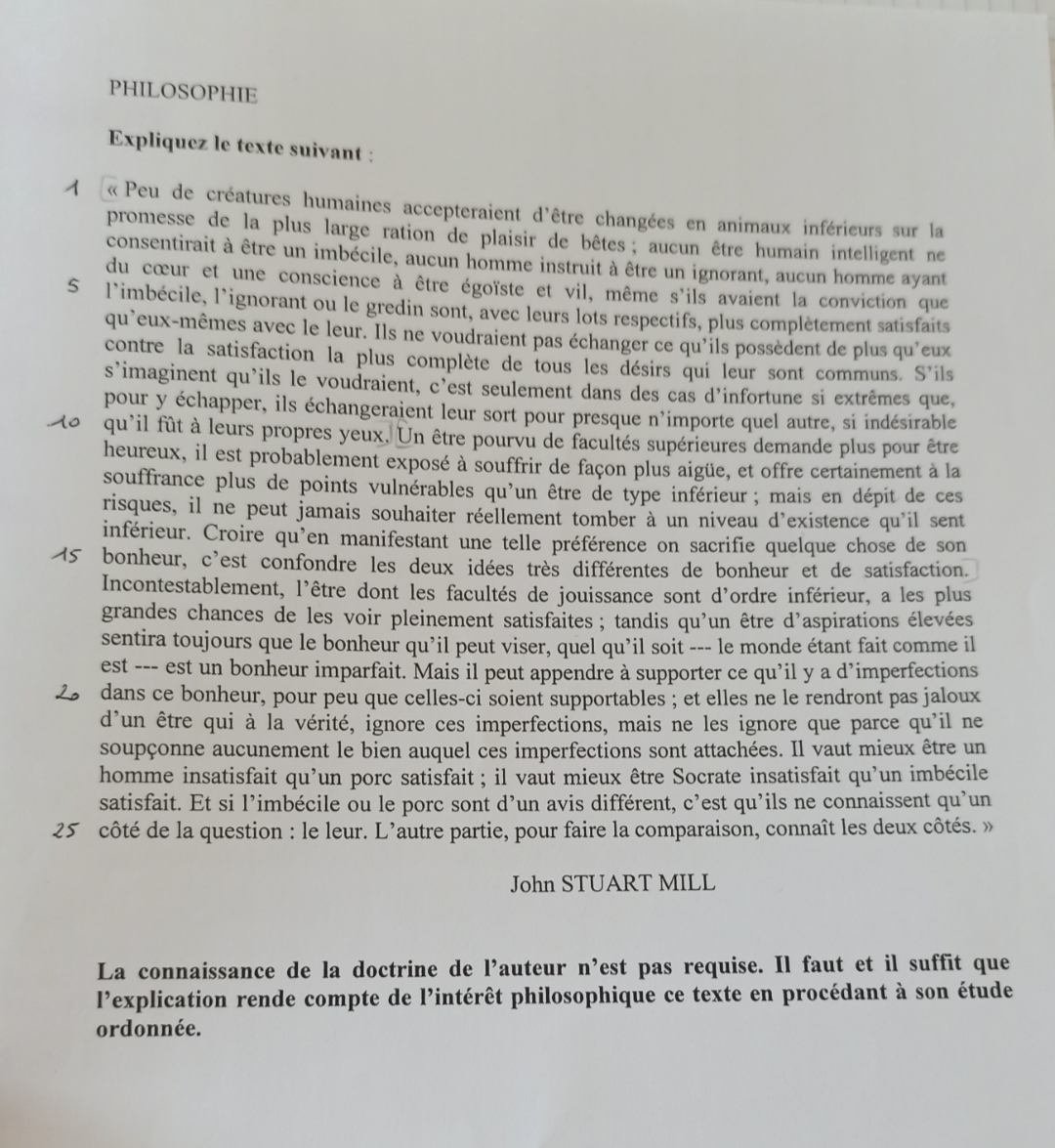 Vous pouvez du coup apercevoir les idées organisatrices du texte : le bonheur contre la satisfaction des désirs. Le bonheur comme recherche de l'homme aux facultés supérieures contre la satisfaction des désirs propre aux animaux, aux bêtes et aux humains aux facultés ou comportements inférieurs. " Un être aux facultés supérieures demande plus pour être heureux " que la satisfaction des désirs, même si ce "demande plus" s'accompagne de souffrance et d'insatisfaction.