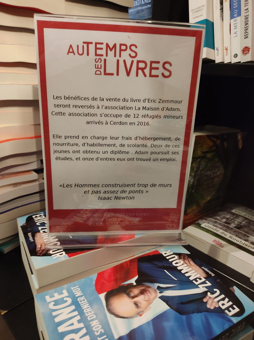 Pour respecter « ses convictions personnelles », une libraire installée à Sully-sur-Loire dans le Loiret a décidé de reverser les bénéfices des ventes du dernier livre d’Eric Zemmour. La totalité de la recette ira à une association qui vient en aide aux migrants.