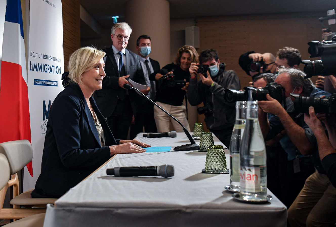 La candidate du Rassemblement national a présenté, mardi, un référendum sur l’immigration et l’identité qui modifierait substantiellement la Loi fondamentale vis-à-vis des étrangers.