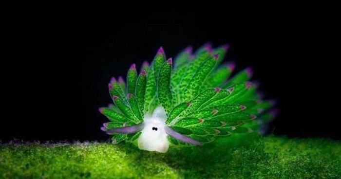 La limace mouton, la Costasiella kuroshimae de son nom scientifique, vit dans les mers tropicales du Pacifique Ouest. Elle est dotée d'une capacité rarissime dans le monde des organismes multicellulaires puisque les étranges feuilles vertes qu'elle a sur le dos sont en réalité des branchies capables de réaliser la photosynthèse.