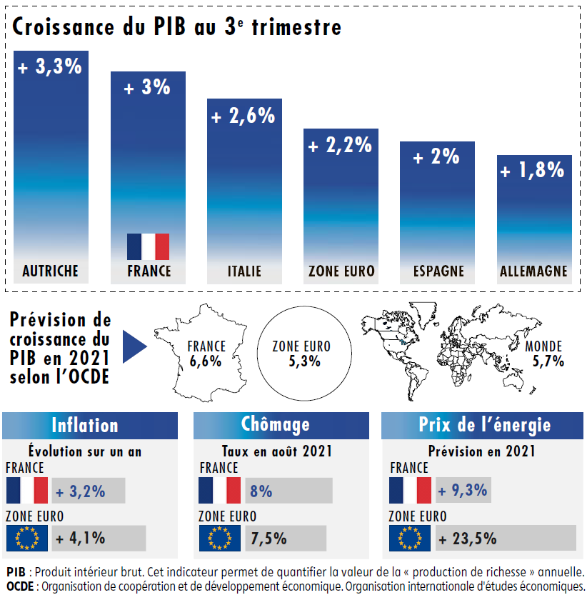 L'économie française a enregistré au troisième trimestre l'un de ses meilleurs taux de croissance en un demi-siècle, à 3%, lui permettant de quasiment revenir au niveau d'avant-crise, malgré les pénuries mondiales qui ont freiné l'industrie