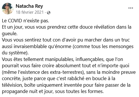 L'incendie de Notre-Dame aurait été provoqué par des musulmans, le coronavirus  serait «un plan des USA et du gouvernement israélien», etc. Son FB regorge d'obsessions complotistes toutes plus trollesques les unes que les autres. Je pense que pour ta crédibilité, faut la laisser tomber. Tu es grand, tu vois.