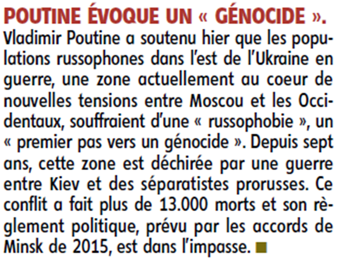 Un discours de Poutine pourtant clair que les dirigeants occidentaux auraient dû prendre davantage au sérieux..la provocation de l'adhésion de l'Ukraine à l'OTAN a été la goutte. Hier un ancien chef français des renseignements militaires reconnaissait que nous avions agité depuis trop longtemps le chiffon rouge.