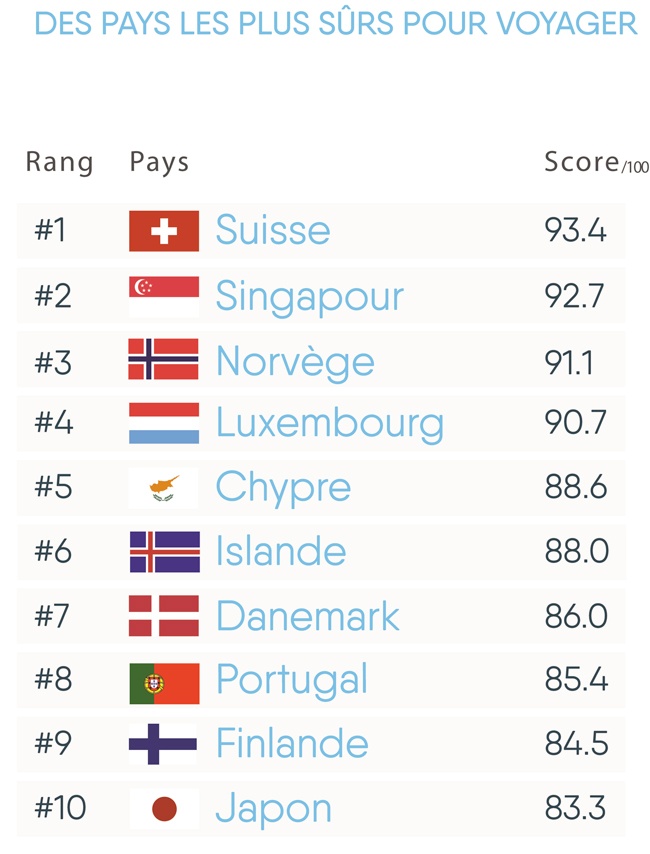 Les pays les moins dangereux sont la Suisse et les pays nordique/scandinave  en particulier l'Islande