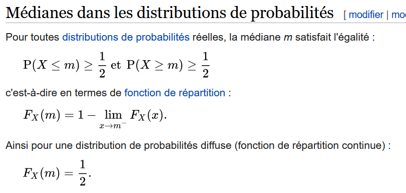 qu'on soit statisticien ou mathématicien, le calcul présenté en introduction pour la médiane de x ... est un calcul ...juste techniquement mais...qui ne calcule pas la médiane de x...qui calcule juste la probabilité pour que l’intégrale de f(x) calculée entre 1 et l’infini soit égale à 0,5 ce qu’on obtient pour x = 2