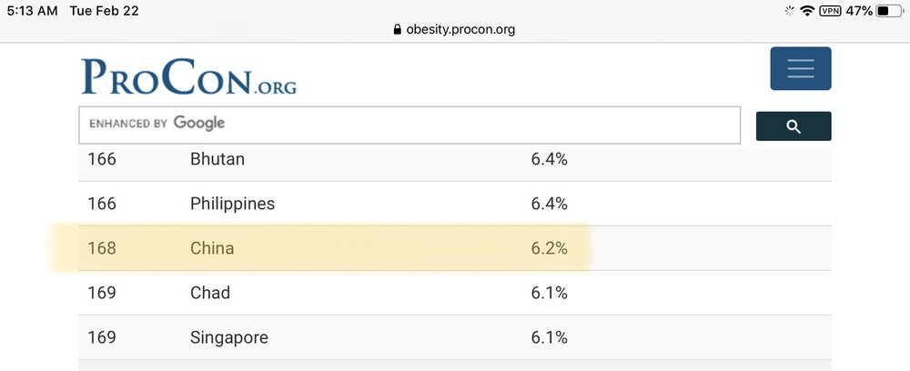 Alors c’est bien possible mais en terme d’obésité les chinois se classent aux alentours de la 160eme place sur 190 en 2016, selon ProCon.org, Alors certes, surchargé pondérale n’est synonyme d’obésité, mais c’est très proche quand même.