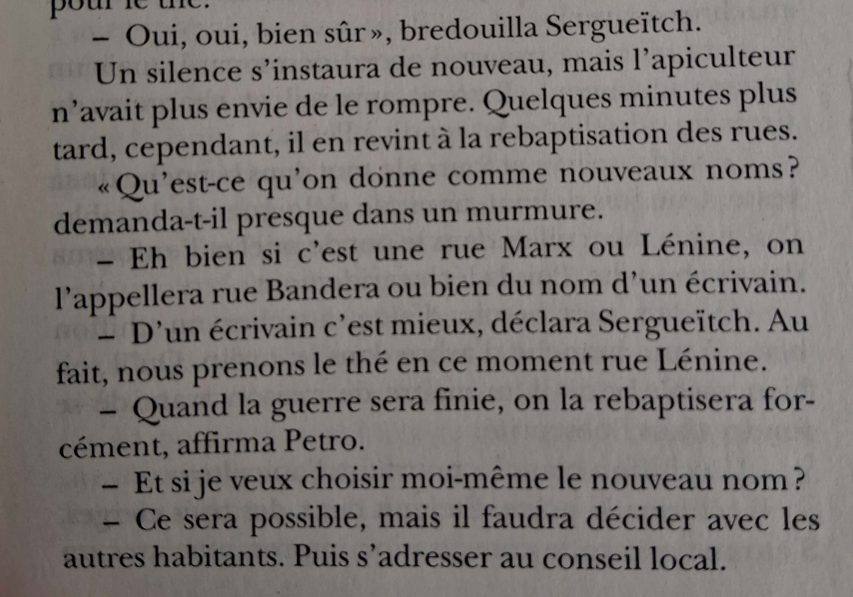 Dans le livre d’Andreï Kourkov, Les Abeilles grises, il est question de rebaptiser les rues après la guerre. Ce sont deux hommes qui parlent : l’un est un soldat de Kiev et l’autre, un villageois du Donbass qui n'a pas voulu quitter sa maison. Un soir, le soldat, un jeune homme, vient lui rendre visite ; il veut simplement discuter avec l’apiculteur qu'il ne connaît pas.