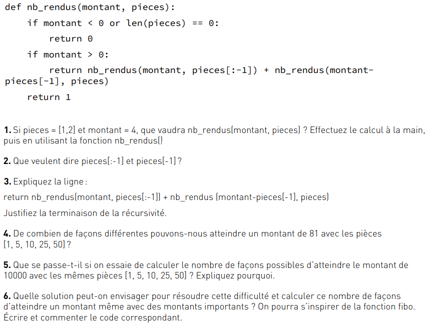 Mais normalement, lorsque montant tombe à 0 (et donc que l'on a une possibilité), c'est lorsque l'on effectue nb_rendus(montant -pieces[-1], pieces).  Donc, que l'on a forcément encore des pièces.