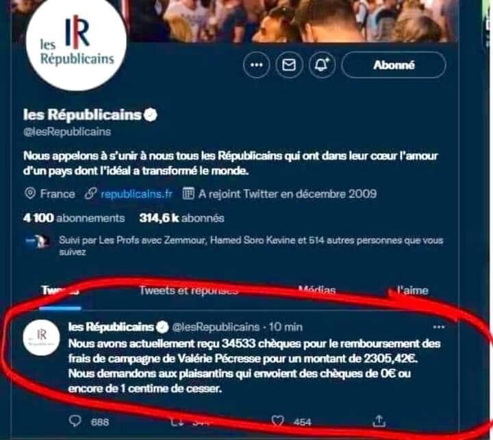 Pécresse continue dans la droite ligne de sa campagne : du grand n'importe quoi... C'est déjà assez risible d'entendre EELV faire un appel au don, mais venant de LR, c'est la cerise sur le gâteau. Etrangement, Pécresse et tous les LR retrouvent un moment les valeurs de solidarités qu'ils aiment tant à conspuer. Quelqu'un chez LR pour leur rappeler que c'est précisément contre cela qu'ils se battent ? Ca vaut ce que ça vaut comme consolation ces temps ci, mais je rêve de croiser un de leur cadre pour leur expliquer ce qu'ils nous expliquent eux même depuis toujours.