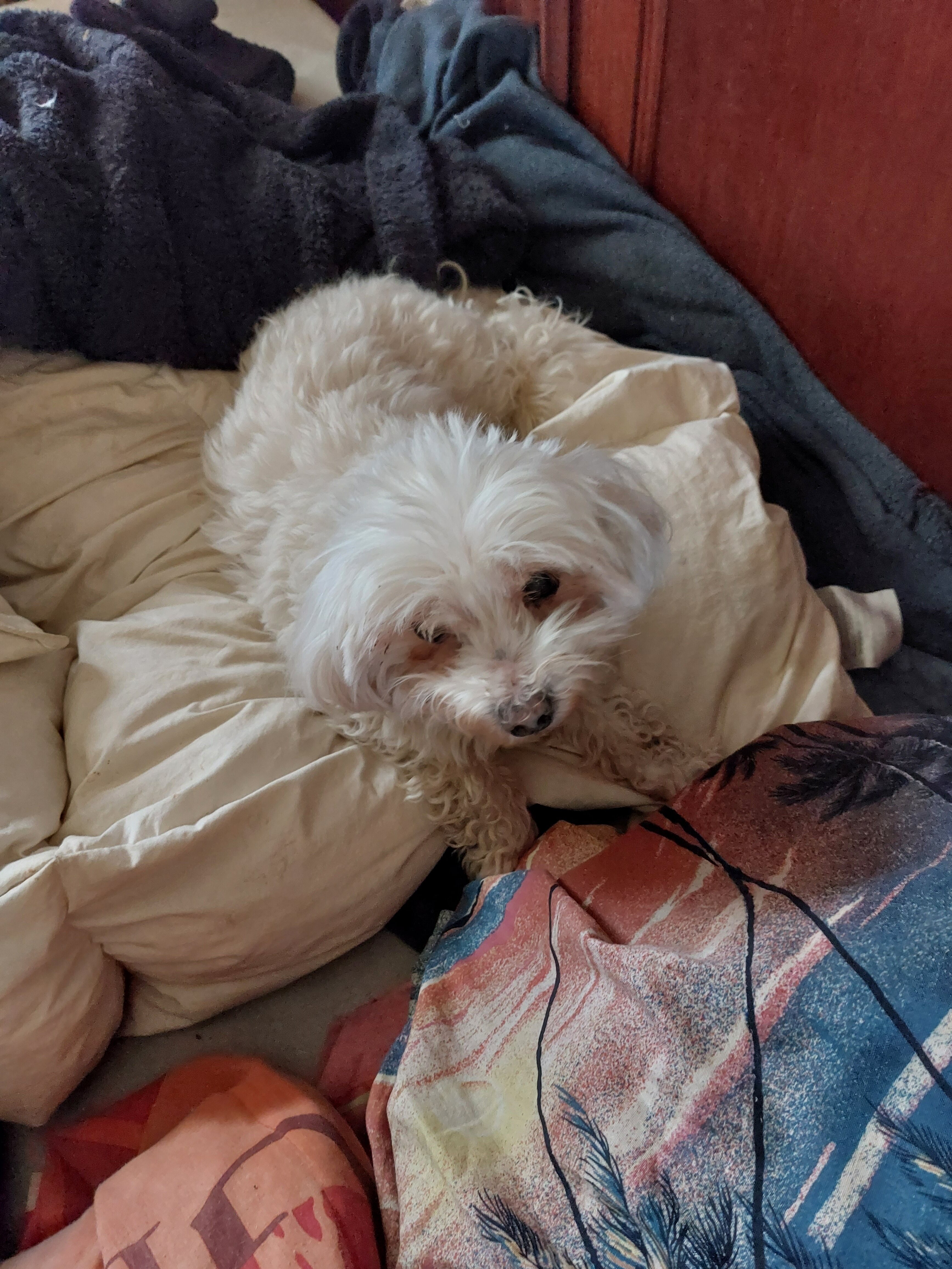 Pour ceux qui ont un peu suivi mon actu, et celle de mon chien Crevette, bichon maltais de 21 ans (record), depuis la mort de son frère jumeau, sa santé psychologique ce n'est pas top. Je récapitule : il a sa propre salle, son propre canapé, mais je le voyais se faire chier comme un rat mort, donc j'ai décidé de faire ce que je n'aurais jamais fait : acheter une télé pour lui. J'ai installé son écran plat en début d'aprem. Je suis anti-télé, mais bon, la fin justifie les moyens, si ses derniers jours doivent être le plus agréables possible, autant briser cette règle de maison.