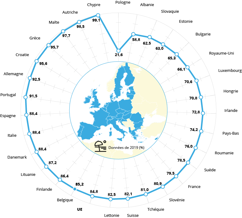 Proportion des eaux de baignade d’excellente qualité dans les pays européens en 2019 (normes communes)