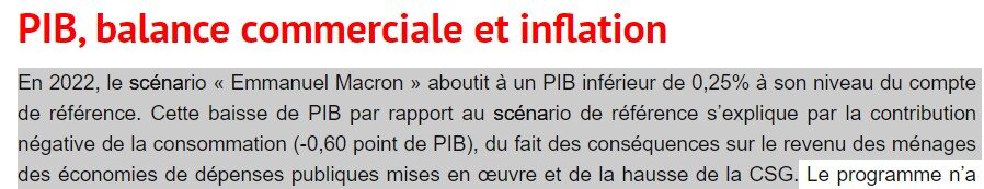 Moais En 2022, le scénario « Emmanuel Macron» aboutit à un PIB inférieur de 0,25% à son niveau du compte de référence. Cette baisse de PIB par rapport au scénario de référence s’explique par la contribution négative de la consommation (-0,60 point de PIB), du fait des conséquences sur le revenu des ménages des économies de dépenses publiques mises en œuvre et de la hausse de CSG