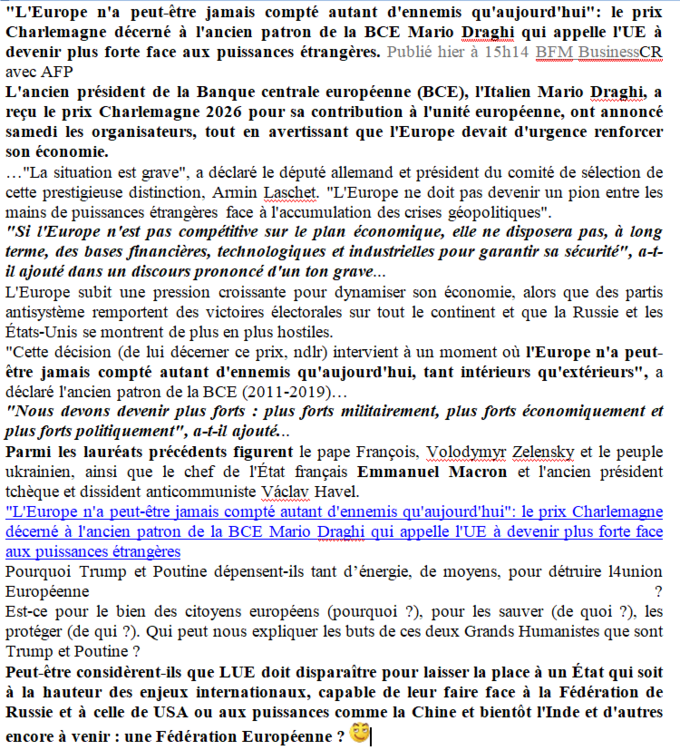 La Russie est une dictature, la Chine est une dictature, les USA deviennent possiblement un système totalitaire, si L'Europe veut rester démocratique* il faut qu'Elle soit une Fédération.