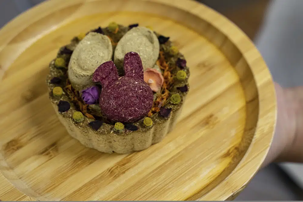 Un gâteau à l’herbe de lapin est préparé à l’hôtel Bunny Style à Hong Kong, le mercredi 18 janvier 2023. Avec la levée des restrictions COVID, les Hongkongais voyagent à nouveau et certains de ceux qui gardent des lapins chez les animaux de compagnie les réservent dans un complexe pour lapins où ils sont nourris, exercés et choyés avec des traitements de spa. Le Nouvel An lunaire du lapin met particulièrement en lumière la popularité des animaux dans la ville bondée de minuscules appartements. (AP Photo/Anthony Kwan)