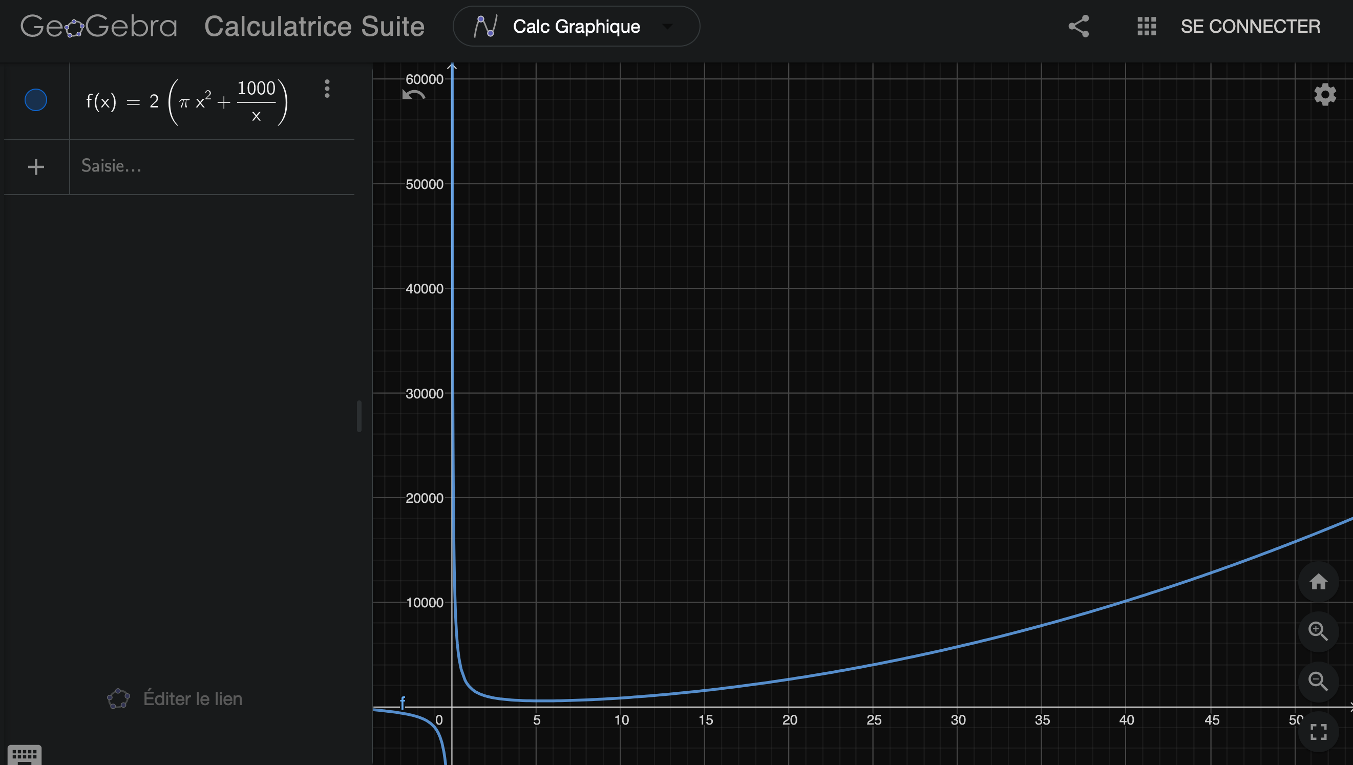 Par curiosité j’ai rentré la fonction dans une Casio. Pour les échelles ( shift/v-window) j’ai pris pour X, 0, 50, scale  1, pour Y,0, 1000, scale  100, ça donne un graphe correct. Après je fais shift/ G-Solv