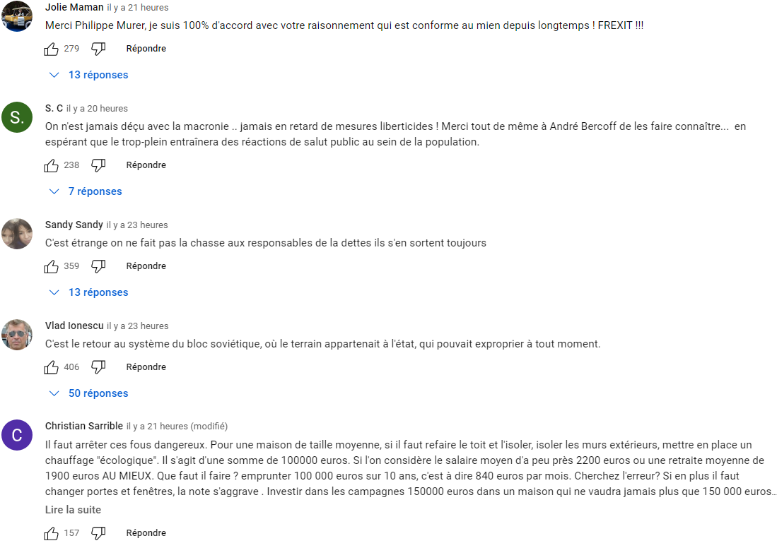 Nan dans ce sujet l'intéressant ce sont plutôt les commentaires sous la chaine Youtube de Sud Radio. On se croirait sur un site complotiste ou autre antis système où ne viennent que les convaincus à 100% de complot. On appréciera la structure des pouces en haut / pouce en bas. On se croirait avec des africains commentant la gloire à Poutine.