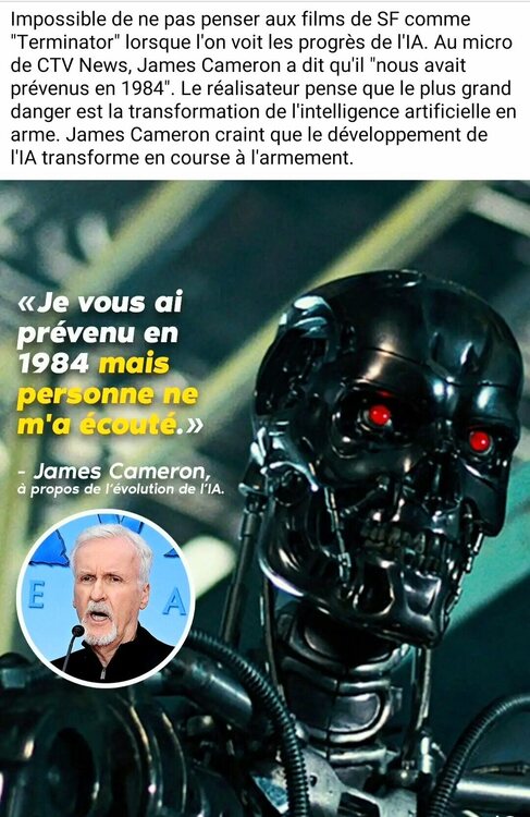 Moi non pour le moment celà ne me fait pas peur, mais j'ai peut être tort ? Craignez vous des dérives, des dangers, etc... ou en attendez vous des avancées, des progrès, des découvertes ? bref, je ne sais plus qui a dit que l'intelligence artificielle est plus dangereuse que la bombe atomique, je crois d'ailleurs que plusieurs personnes ont fait déjà cette comparaison hasardeuse et pas forcément judicieuse. A suivre avec intérêt... quand le train a été inventé, ou le téléphone, ou l'avion et j'en passe, les gens aussi ont eu peur... faut il se méfier de toute nouveauté alors ?
