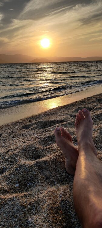 Je n'aime pas la plage encombrée de la foule des bronzeurs pendant la journée (l'idéal serait d'avoir sa plage privée !) mais j'avoue que le soir, à la douce lumière du soleil couchant, l'impression que la plage est à soi tout seul... le clapotis des vaguelettes...!  :happy: