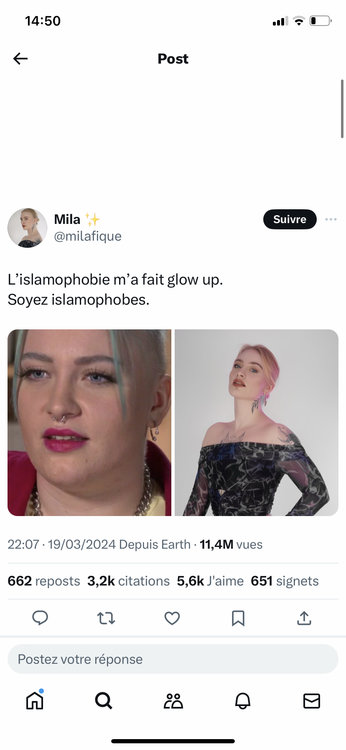 Je suis Mila depuis un bail et je la suis because il est sur les réseaux. Donc bien sûr qu’à aucun moment elle n’aurait dû se faire insulter et harcelé, des Mila y’en a 50 tous les jours et Mila c’est carrément devenu son gagne pain de faire le buzz elle aime être sous le feu des projecteurs et elle est instrumentalisée depuis le début. Elle prend des positions politiques et pas que sur le droit d’être islamophobe, le droit au blasphème toussa. Elle harcèle aussi elle affiche des gens sur son compte, elle veut et le dit d’ailleurs voir les vagues de haine arriver. Si cela t’intéresse tu devrais aller voir elle reste quand même une gamine de son temps qui veut percer coûte que coûte et c’est du très bas niveau.