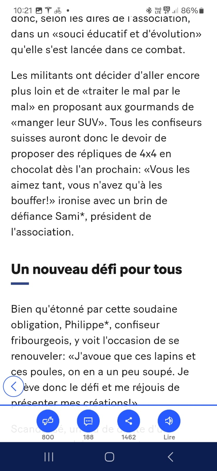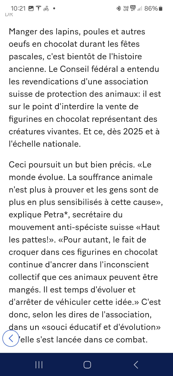 "Le site « 20minutes » rapporte qu’une association antispéciste a veillé à ce qu’on ne puisse plus manger de lapins en chocolat à Pâques. A partir de 2025, ces confiseries prendront la forme d’un SUV (??!)."