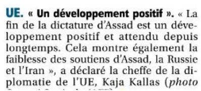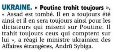Et voilà, le Sauron au rabais du Kremlin a perdu son allié syrien! La rapidité avec laquelle le pouvoir de Bachar s'est effondré en dit long sur l'affaiblissement du régime et de ses soutiens russes. Qui sont les rebelles qui disent s'être emparés de Damas? Ont-ils été aidés (discrètement) par les Occidentaux? Le peuple syrien a-t-il juste échangé un tyran sanguinaire contre un pouvoir islamiste oppressif? Trop tôt encore pour répondre à ces questions. En tout cas les Russes ont dû évacuer la base navale qu'ils contrôlaient, et regagner leur pays en vitesse et peu glorieusement. Espérons que ce ne soit qu'un début.