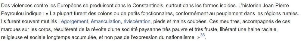 Cela n’autorise pas de 7 octobre. Au lieu de parler de la transformation de Gaza en places de parking par l’armée israélienne, abordons un sujet révolu et sur lequel tout le monde est d’accord : l’indépendance d’Algérie (un pays qui n’existait pas avant la colonisation française). Les victimes d’attentats menés par les terroristes autochtones ne méritaient pas leur sort. Cependant, étant donné les massacres opérés par l’armée coloniale française sur ces mêmes autochtones, la volonté farouche de la société pied noire de pratiquer une séparation nette entre blancs et arabes, en ne leur accordant pas les mêmes droits (on appelle cela apartheid, ségrégation), et toutes les autres formes d’exactions pratiqués par les colons : viols de filles autochtones, vols de terres.
