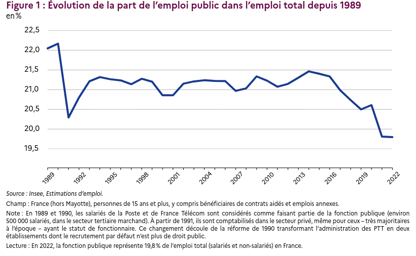 Nous pouvons constater une baisse significative de cette part depuis 1989 et plus précisément depuis 1992 (à cause de l'artefact de la privatisation de la poste en 1990).