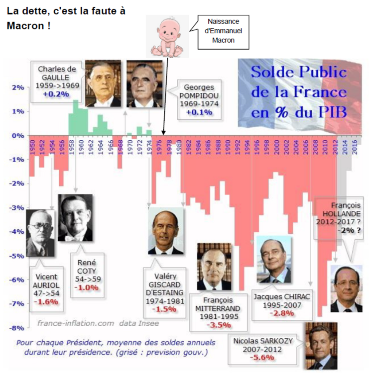 Vous avez raison, ce graphique ne dit pas tout. Par exemple, il ne dit pas que Giscard a eu à gérer les deux premières crises pétrolières, que Mitterrand n'a rien eu de semblable à gérer me semble-t-il. Par contre sur le graphique on voit bien, en fin de son second mandat, les résultats de ses "investissements" réalisés au début de son premier mandat. Chirac n'a pas eu trop à se plaindre, quand à Sarkozy, il s'est "offert" une crise financière puis économique. Hollande, le moins dépensier, a eu à intervenir au Mali. Macron lui a connu les GJ, manipulés par Poutine via le duo Salvini-Di Maïo, la Covid 19, les attaques de Poutine en Afrique via les Wagner, la guerre en Ukraine et maintenant les frasques de Trump. Malgré ça, il a quand fait diminuer le chômage, commencer à réindustrialiser la France, baisser les impôts (en tous les cas les miens, petit français moyen).